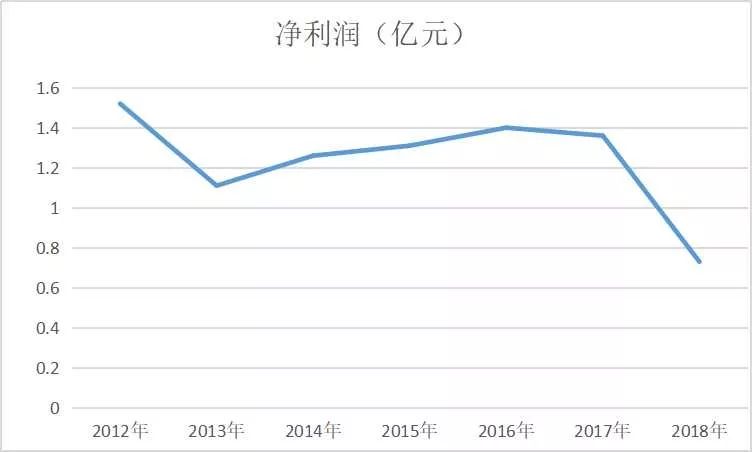 这并不是全聚德第一次出现业绩增长乏力,从2012年到2018年,全聚德的营业收入分别为19.44亿、19.02亿、18.46亿、18.53亿、18.47亿、18.6亿、17.77亿,净利润分别为人民币1.52亿、1.11亿、1.26亿、1.31亿、1.40亿、1.36亿、0.73亿。