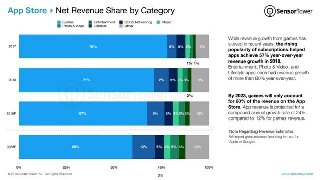 以 Sensor Tower 的数据为佐证,App Store 中游戏收入占总收入的 67%,而 Google Play 中则是这个比例扩大到 85%。