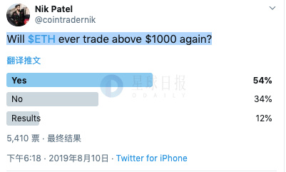 5.推特调查:54%的参与者认为ETH有可能再次超过1000美元