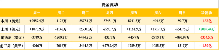 资金方面,本周资金波动较大,周五净流出资金最多,超过 8700 万美元;周一净流入资金较高,约 3 千万美元。