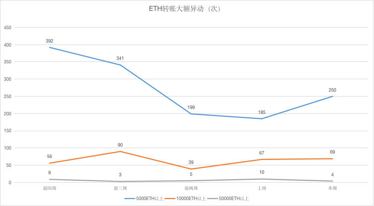 Tokenview数据显示,“5 千 ETH 以上”转账次数本周达到 250 次,环比上涨超过 30%;“1 万 ETH 以上”以及“5 万 ETH 以上”转账次数基本平稳。
