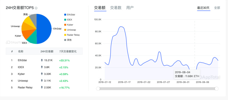 据DAppTotal.com DEX专题页面数据显示:已统计的 17 个基于以太坊网络的 DEX 项目,过去一周链上交易额共计 187050 个ETH,合计 3928 万美元;其中,ETH 2DAI过去一周交易额增长最快,超过30%。