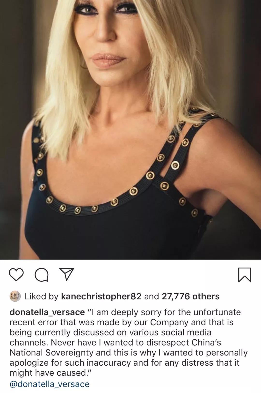 Versace除了在品牌官方社交平台发布消息,创意总监Donatella Versace还在个人Instagram账号上发布道歉声明