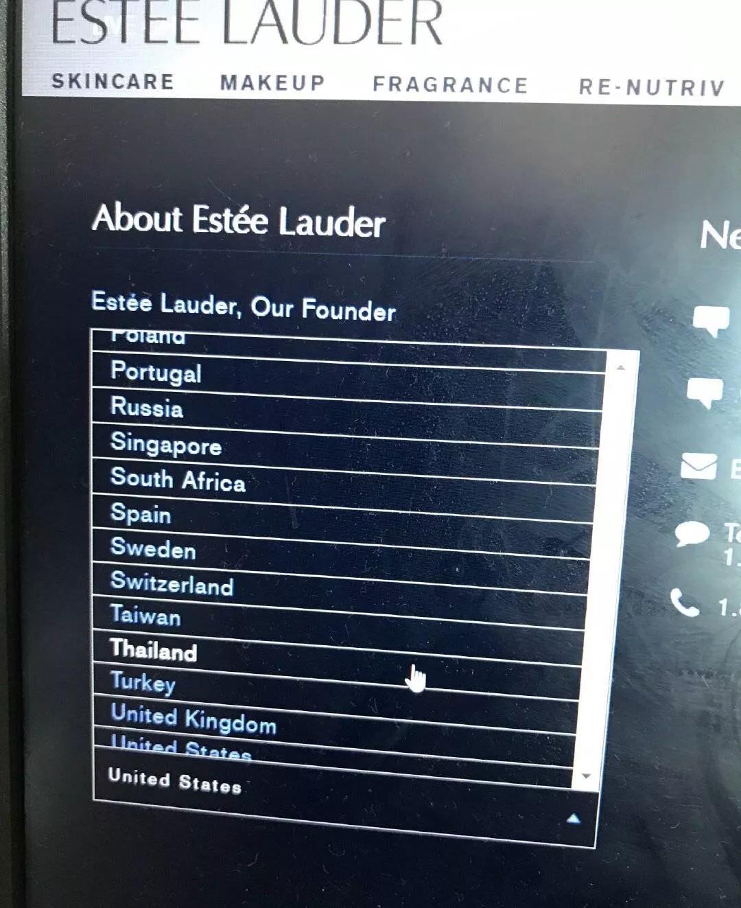 雅诗兰黛官网选择国家的界面竟然出现将台湾与其他国家并列的情况