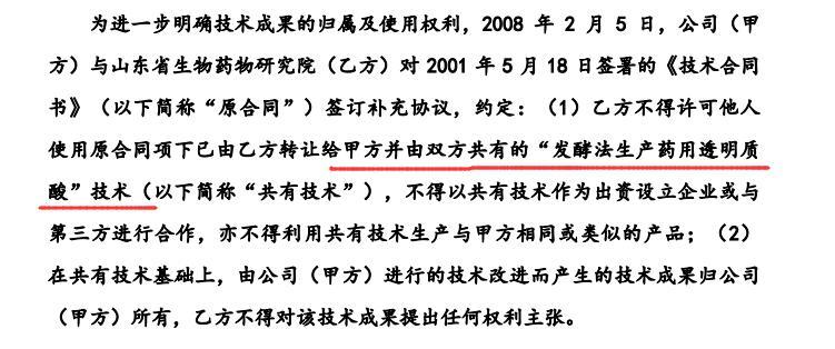 2000年1月,华熙生物前身山东福瑞达生物化工有限公司成立。2001年5月,华熙生物向山东省生物药物研究院购买了发酵法生产药用透明质酸的初始技术。根据协议要求,后者约定向华熙生物转让“发酵法生产药用透明质酸”项目,提供项目全部技术资料,并指导公司生产出三批合格产品。为进一步明确技术成果的归属及使用权利,2008 年2月,华熙生物与山东省生物药物研究院对2001年5月签署的《技术合同书》签订了补充协议。