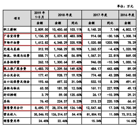 与研发投入形成鲜明对照的是,2016-2018年,华熙生物的销售费用高速增长,分别为1.07亿元、1.25亿元、2.84亿元,占当期营业收入的比例分别为14.60%、15.34%和22.46%。其中,广告宣传费在2018年飙升,同比增长483%,市场开拓费也同比增长326%。