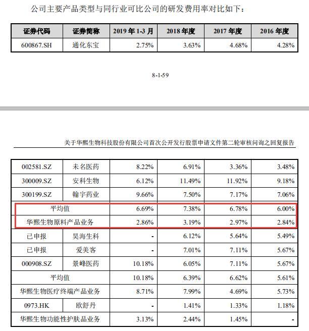 根据第二次问询的回复,华熙生物在医疗终端产品、功能性护肤品等业务方面的研发费用率与同行业主要公司相当,但在占营收51.70%的原料产品业务方面,研发费用率明显要比同行业低。