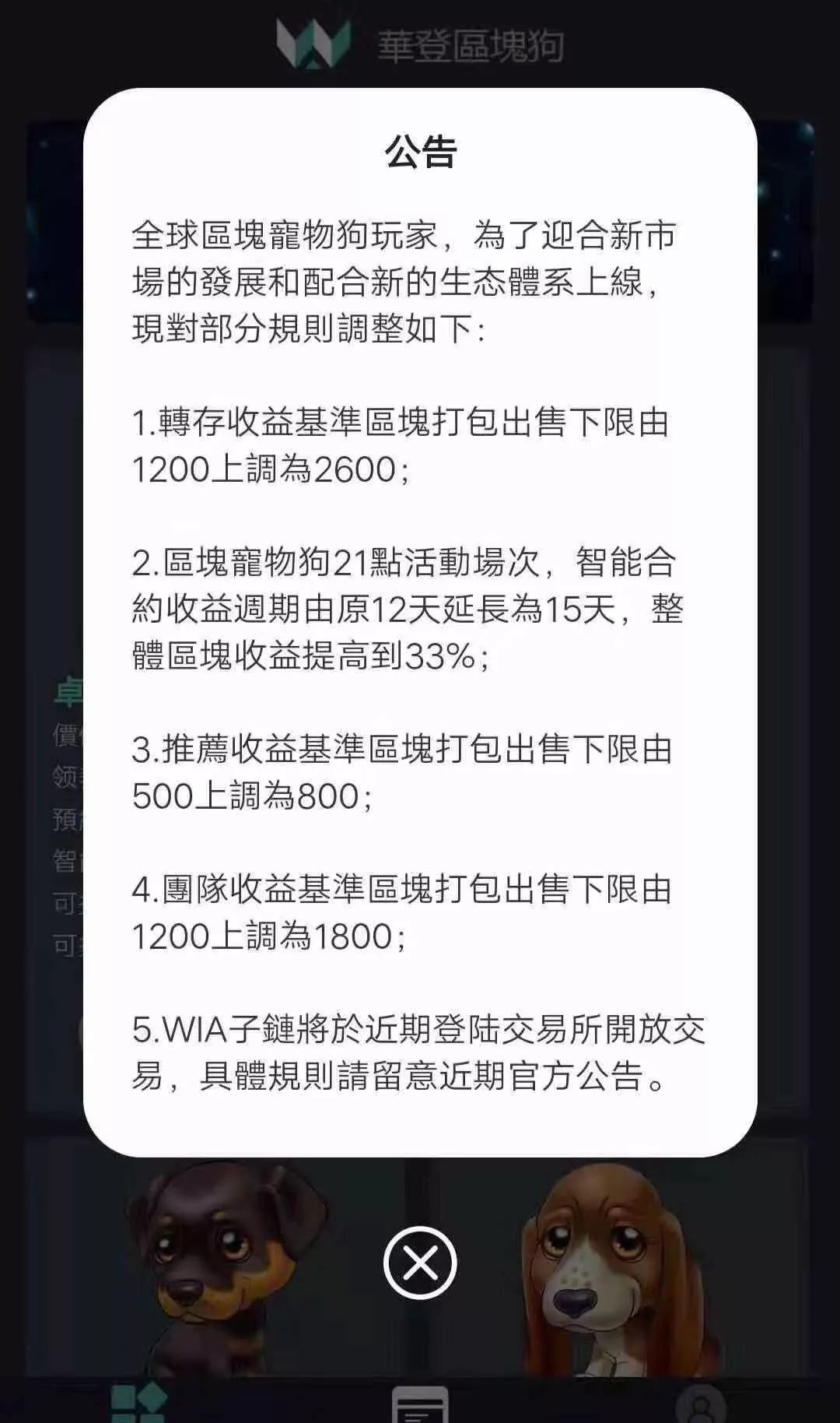 或许是“杨超越”起了作用,灵儿在 8 月 10 日打开 APP,欣喜地发现了团队的新公告。新公告表示将按照计划于 16 日开放区块狗领养,但将作出以下调整:将关闭点对点交易,兑现渠道仅允许区块链资产,WIAC 将开放兑换,受该公告的利好影响,WIAC 也大涨至 7 元有余。