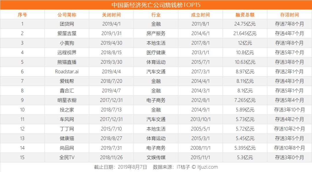 IT 桔子数据显示,截止 2019 年 8 月 7 日,中国新经济死亡公司烧钱榜 TOP15 名单合计获得 150.45 亿元投资。