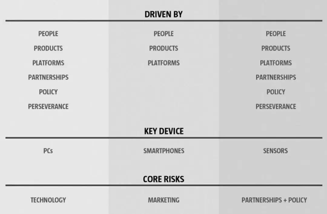 Steve用四个关键性指标,对这三波浪潮进行了非常直观的对比。请看下图: