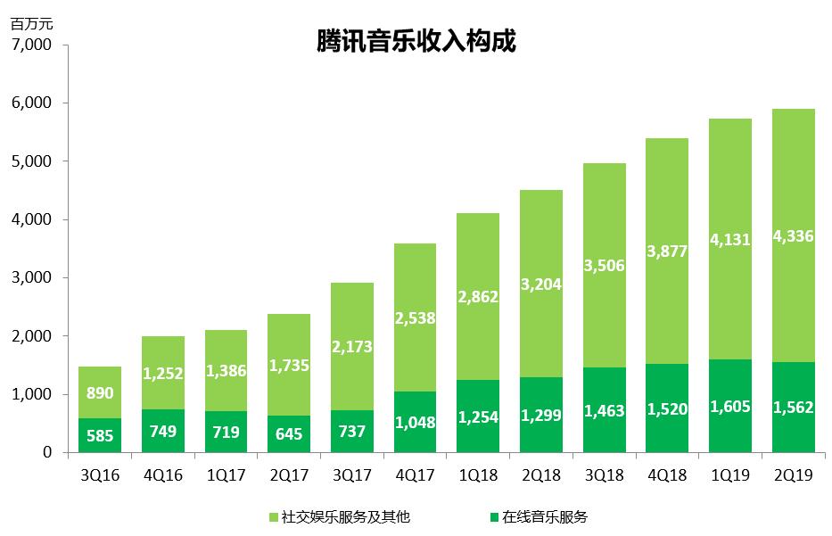 财报数据显示,2019年第二季度,社交娱乐业务付费用户数,同比增长16.8%至1,110万人,高于上季度的同比增速 13%,在线音乐服务业务付费用户数同比增长33.0%,至3,100万人,高于上季度的同比增速 27%。