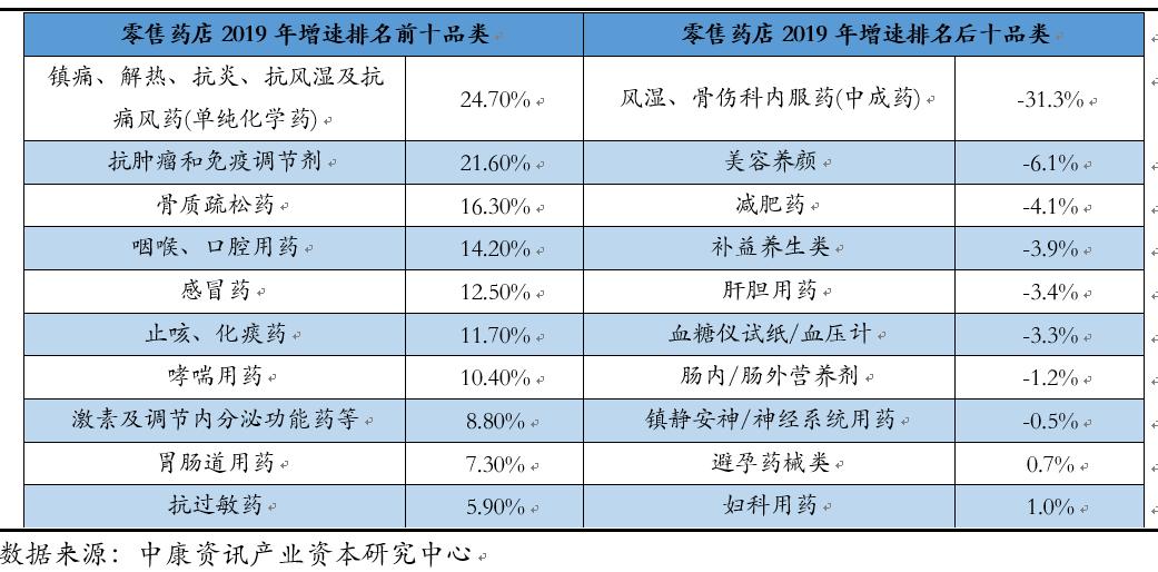 图表6. 零售药店2019年增速排名前十品类及后十品类