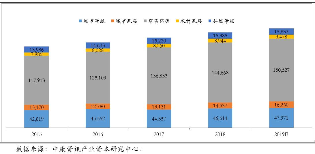 医药零售作为医药第二大终端,近年来受医改的影响,增速持续回落,预计2019年增长率仅为4.5%。其中药品市场增长5.4%,非药增长0.3%;处方药增速为6.8%,非处方药为4%。