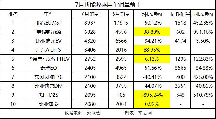 在最新的7月份新能源乘用车销量前十榜单中,多数主流车企的主力车型的销量出现环比大幅下滑,其中包括北汽新能源EU系列、比亚迪元EV、比亚迪唐DM、奇瑞EQ、东风风神E70等热销车型。