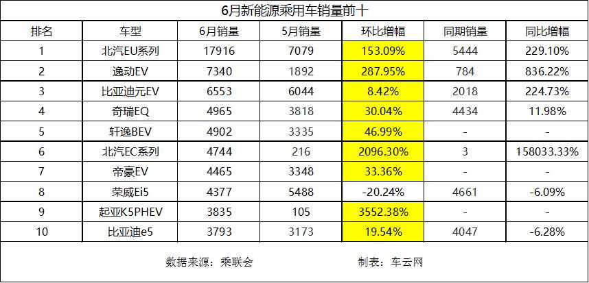 反观6月份,排行前十的新能源汽车几乎全部实现了环比暴增的景象。 比如,北汽新能源EU系列6月份销量为17916辆,环比5月份大增153%,北汽新能源EC系列甚至环比暴增2096%,长安逸动EV以往很少能在前十榜单中看到它,但是在6月份,这款纯电动汽车升至榜单第二,环比大增288%。