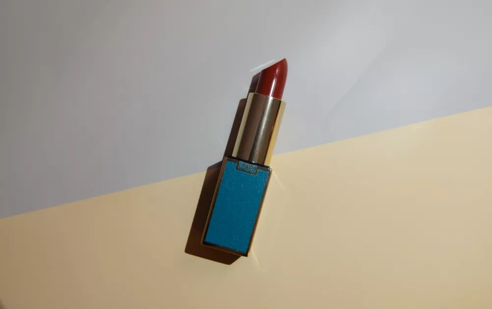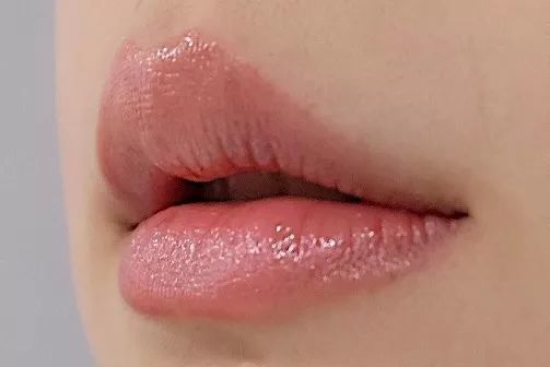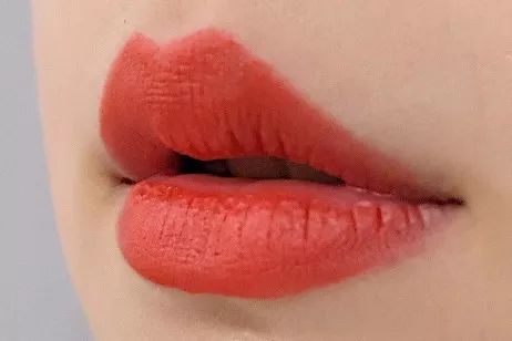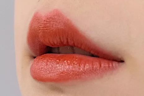 膏体的绛红色在上嘴之后更像是水红色。唇色深的人上唇会显得有一点橘。