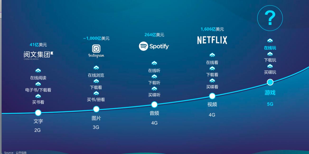 内容云化的市场从文字类内容开始出版物、电子书、在线看支撑阅文集团这样的独角兽再到视频的光盘、下载、在线看各种电影、综艺、头部剧集,到今天火山、抖音、快手游戏的云化从早年的Web Game(页游)、到今天的微信小游戏、其实都是阶段性的。真正的游戏内容云化进程2019年才开始,也是云游戏概念提出来10周年之际。