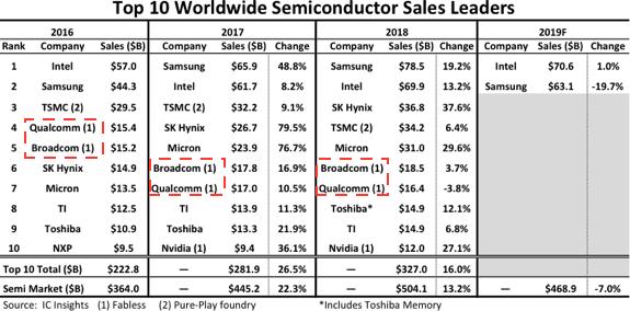 从市场研究公司IC Insights发布的全球半导体销量领导者排名中可以看出,高通和博通在名次上一直不分上下,可见博通收购高通并不是狮子大开口。