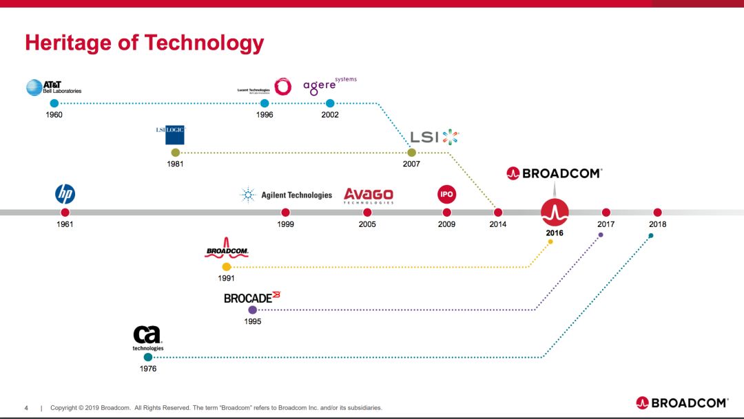 博通最早是从1961年惠普成立的半导体产品部门开始的,后来到1999年,惠普在新上任的CEO卡莉·菲奥莉娜带领下对惠普内部结构进行了调整,其中就包括将半导体部门在内的元器件、测试与测量、化学分析和医疗仪器业务拆分出去,组成一家名为安捷伦(Agilent)科技公司。