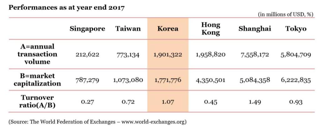 2017年东亚各股市,韩国股市交易活跃程度仅次于A股,成交量与港股类似。数据来源:世界证券交易所联合会