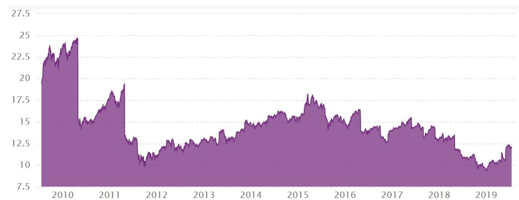 此外,韩国股市的市盈率比较低,多年平均市盈率徘徊在17倍以下,在2019年的市盈率更是在10倍上下,与港股相当。