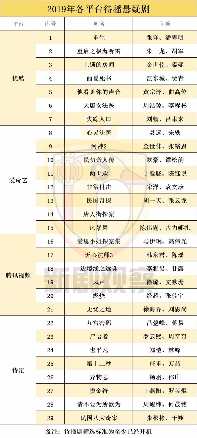 尽管在政策审查趋严与观众审美疲劳双重压力作用下,悬疑剧市场整体呈疲软发展态势,但毕竟是网络剧安身立命的重要题材之一,平台排兵布阵时,依然将悬疑作品作为重点内容进行筹备,接下来一段时间,大约将有29部含有悬疑元素的剧集要与观众见面。