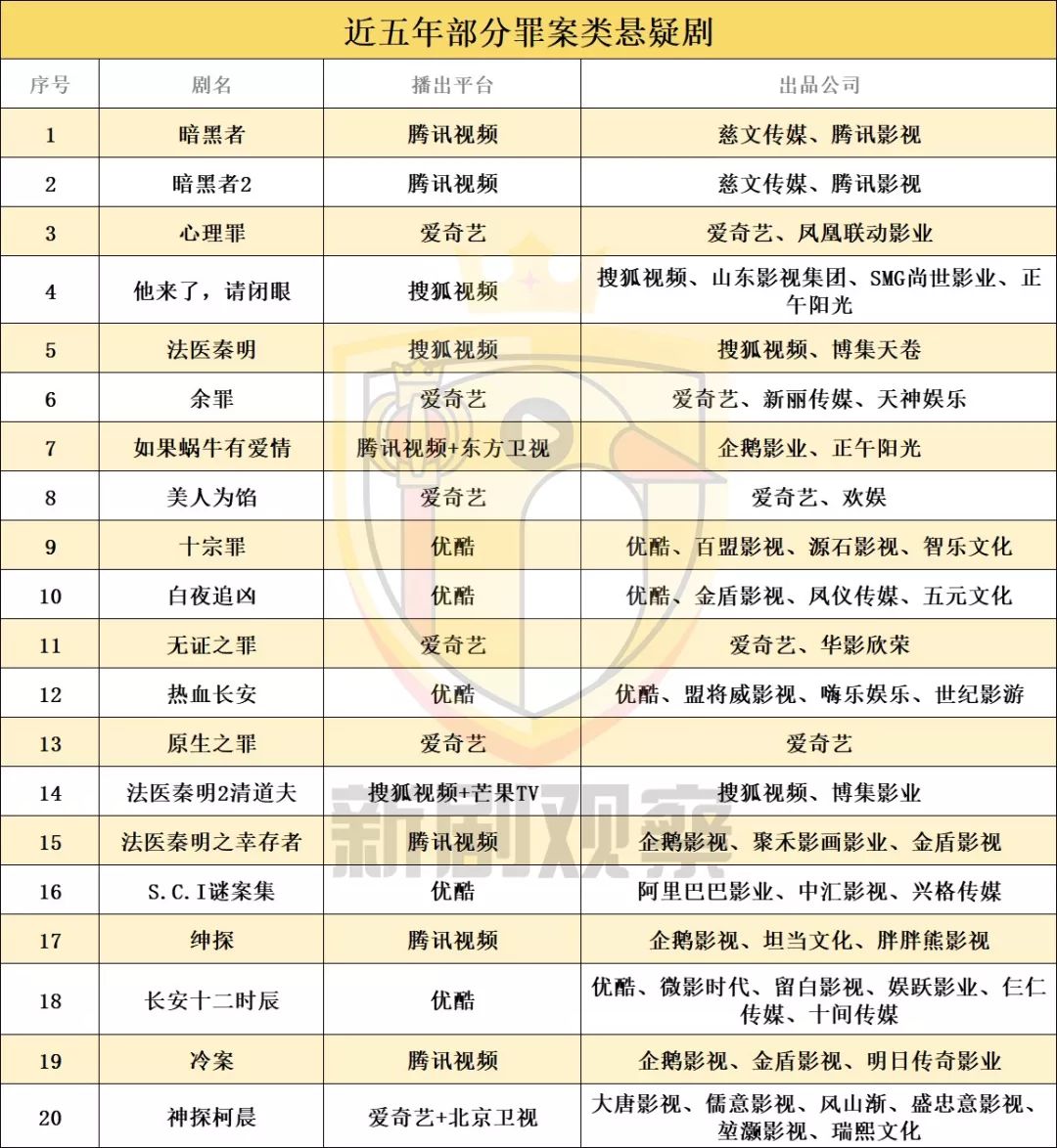 这些作品中,2014年的《暗黑者》,2015年的《心理罪》,2016年的《余罪》《法医秦明》《如果蜗牛有爱情》,2017年的《白夜追凶》《无证之罪》,2017年的《S.C.I谜案集》,2018年的《冷案》,等等,豆瓣评分均在7分以上。