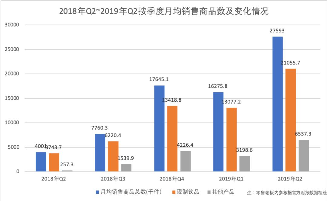 财报显示,2018年Q2~2019年Q2的五个季度,瑞幸按季度现制饮品月均销售商品数分别为374万件、622万件、1342万件、1308万件、2106万件,期间环比增速分别为66.16%、115.72%、-2.55%、61.01%;按季度其他产品月均销售商品数分别为26万件、154万件、423万件、320万件、654万件,期间环比增速分别为498.48%、174.46%、-24.32%、104.38%。