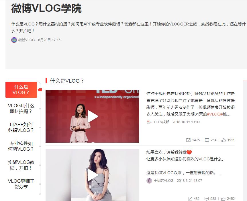 在2018年的V影响力峰会上,微博就已经率先宣布了未来将成立Vlog学院,对Vlog创作者进行线上线下指导,目前“微博Vlog学院”从5大维度的进行创作指导,从Vlog是什么、到拍摄器材、剪辑软件、Vlog拍摄、Vlog导师分享。
