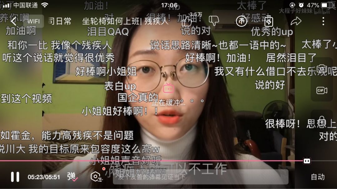 在“聊聊我的职业”专题中UP主”大程子好妹妹”分享了坐轮椅如何上班,不为人知的残疾人工作的一面,让弹幕中不少人为她加油。