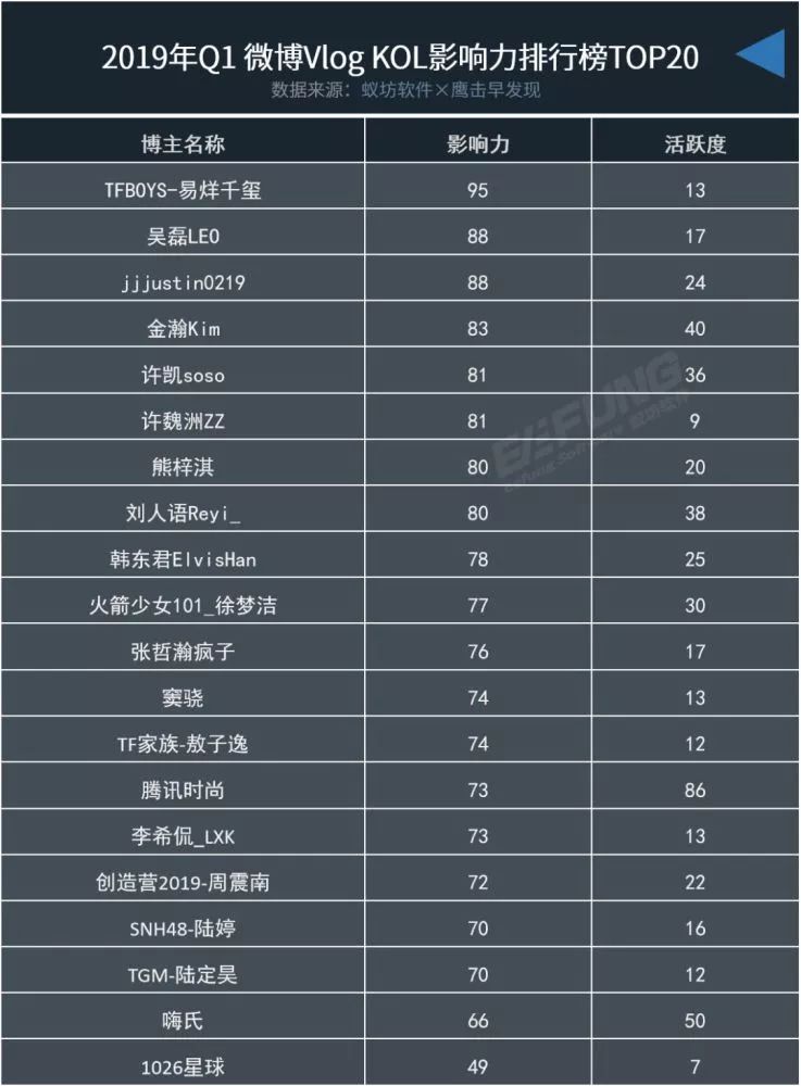微博是一个很典型的头部流量集中的平台,明星是拍摄Vlog的主力军。根据蚁坊软件发布的《2019年Q1微博Vlog数据研究报告》,微博Vlog KOL的TOP 20中有17位都是明星艺人,可以看到微博的Vlogger-KOL多为明星。