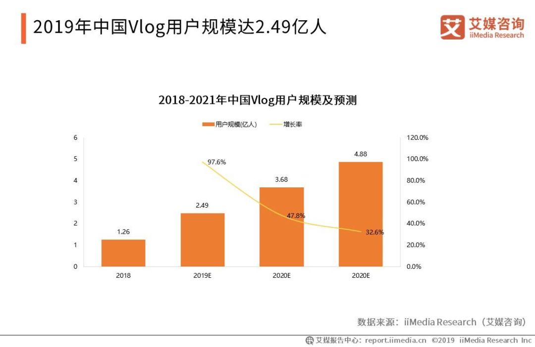 根据艾媒咨询数据显示,2019年中国Vlog用户规模达2.49亿人,预计未来中国Vlog用户规模仍将保持稳定增长态势。