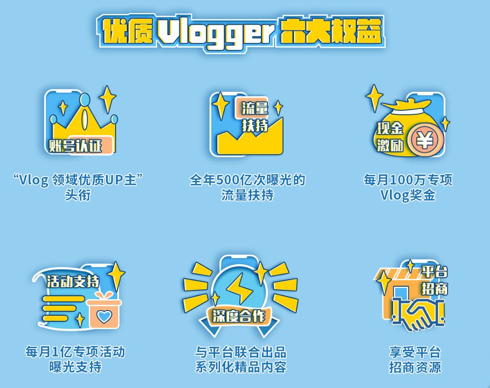 今年5月31日,B站加码推出了“Vlog星计划”,在激励创作方面,除了常见的流量扶持、商业资源外,还做出了真金白银的举措,每月设立100万 的专项Vlog奖金,同时优质的Vlogger还可以和平台联合出品系列精品内容。