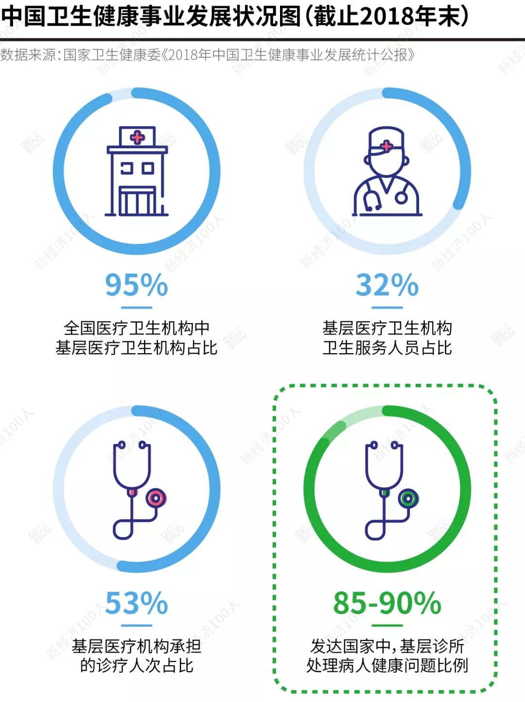 一组广为流传的数据:2018年末,全国医疗卫生机构中基层医疗卫生机构占比约95%,但它们仅拥有全国32%的卫生服务人员。在发达国家,基层诊所能处理病人85%-90%的健康问题,国内只有53%的诊疗人次由基层医疗机构承担。(数据来源:国家卫生健康委《2018年中国卫生健康事业发展统计公报》)