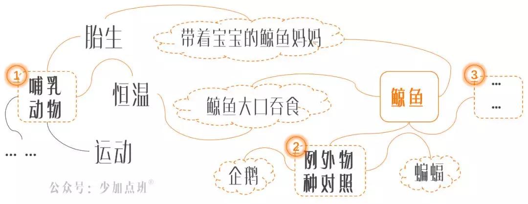 内化,是从你已掌握的旧概念作为起点,即哺乳动物,并从新知识,鲸鱼中找到它跟哺乳动物的诸多共性,比如胎生恒温,然后进行“画面联结”。
