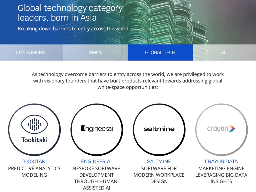 Jungle Ventures官网的海外投资项目中,Engineer.ai的描述为“通过人工辅助AI定制软件”。