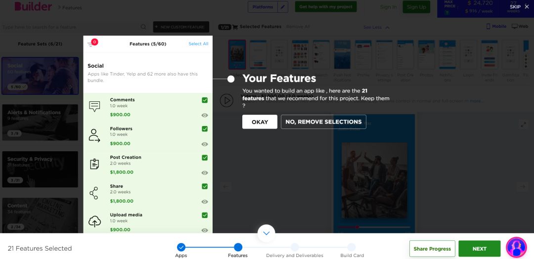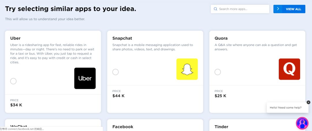 有意思的是,在创建前,用户还可以选择与他们的想法类似的现有应用程序,例如Uber或Facebook。然后,Engineer.ai可以开始自动创建应用程序的基础部分。