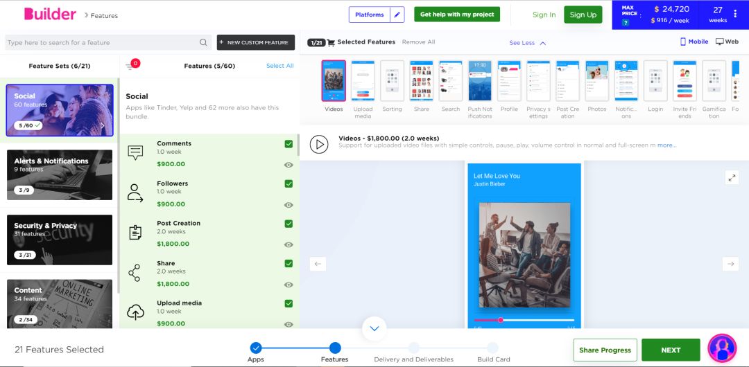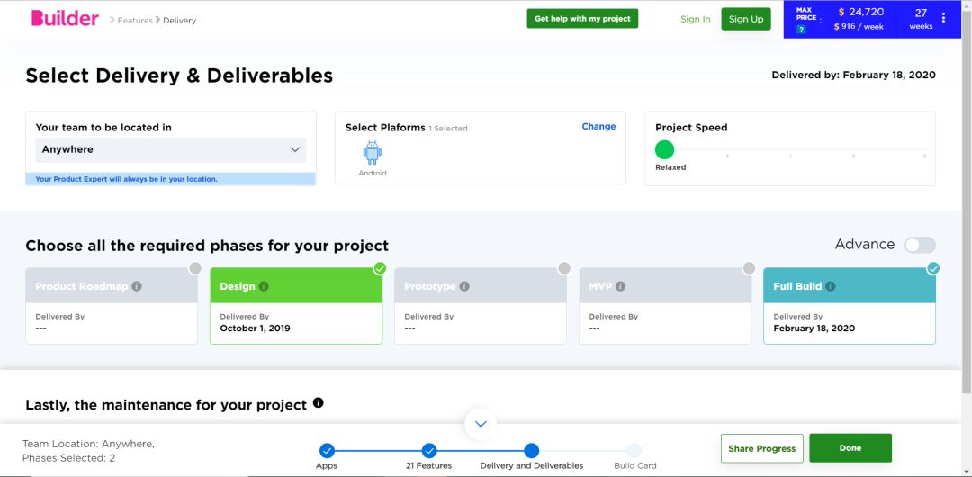 这时你会发现右上角出现了一个最大预估价格,此时不谈钱或许有点伤感情了。果然下一步就是问我需要搭建的平台以及制作速度。