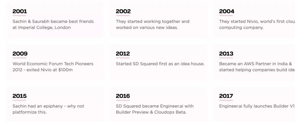 Engineer.ai的两位创始人Sachin Dev Duggal和Saurabh Pradeep Dhoot从帝国理工毕业之后,还在2004年一起创立了一家叫Nivio的公司。该公司致力于桌面虚拟化服务,并且于2007年宣布对其首个基于Windows XP的在线桌面服务进行测试,功能类似于今天的云电脑,可以允许客户在没有个人计算机的情况下使用计算机应用软件。