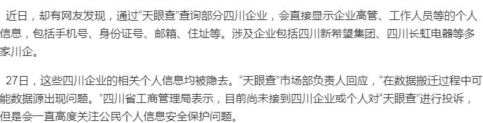 ▲四川商报关于天眼查平台出现部分企业高管个人身份证等私人信息的报道