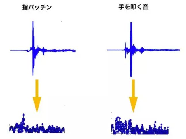 小哥使用了频谱分析来提取打响指和敲桌子两种单发音的不同,如下图经过频谱分析处理后可以发现更显著的差异: