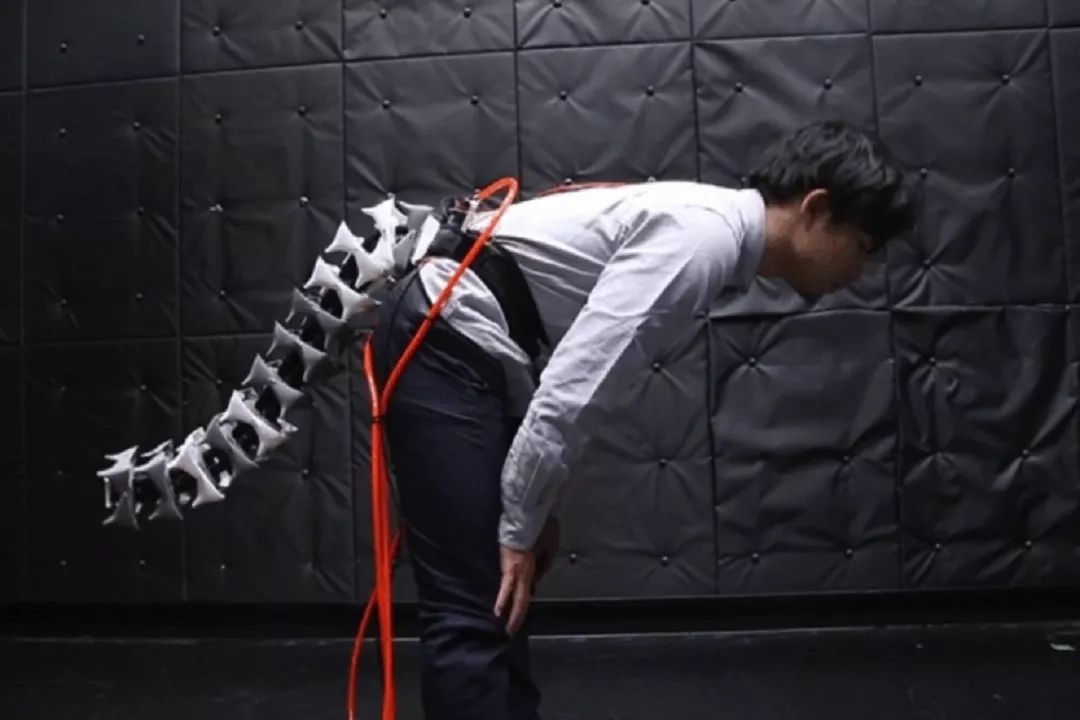 这部长达一米的机器设备被称为 Arque,之所以设计成尾巴是运用仿生学原理,如猎豹的尾巴能使其在跑动和攀爬时保持平衡。安装在人身上的Arque“能像钟摆一样摇动,当人类倾斜身体时,尾巴像反方向移动”。