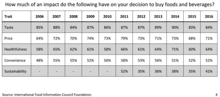 以下跨度为 10 年的调查数据指出,人们在购买食物和饮品时,口味和价格一直都是最大头,如果能在这个基础上「不杀生」就获得,那当然也是一个加分项。
