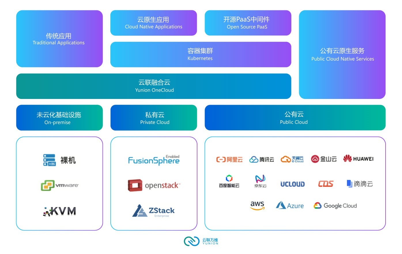 针对以上痛点,云联万维推出了融合云解决方案,融合管理分布在多云环境中的所有异构IT基础设施,构建一个融合云平台,让企业只需基于“融合云平台”构建技术栈和进行运维管理,从而降低企业运营成本,提高效率。
