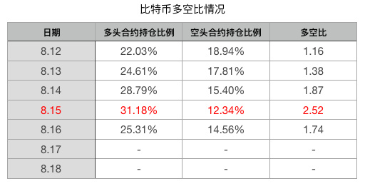 8月10日至8月16日期间,比特币在连续横盘4日后掉头下跌。OKEx比特币合约精英账户的数据显示,这7日中多头成了市场主力,最高可达空头的2.5倍,达7月以来的最高水平。另外,比特币合约持仓量在15日达到7.69万比特币的峰值,较上周最大上升了80%。