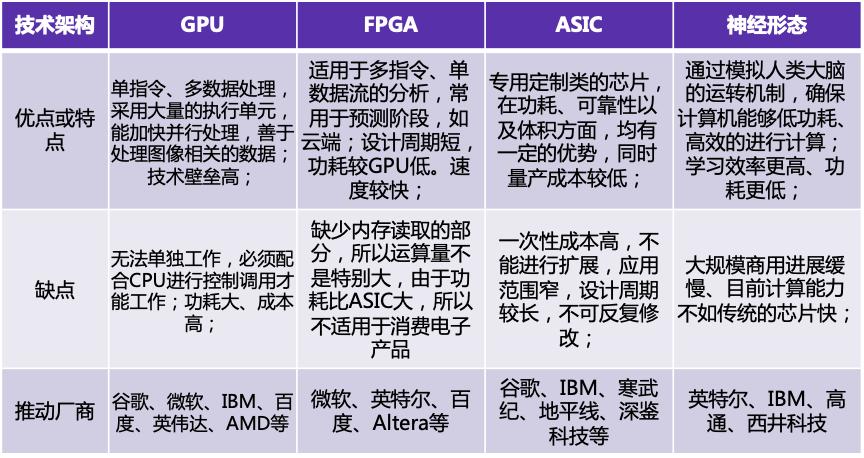当前,人工智能芯片的技术架构主要分为四类,第一类为通用性的芯片,如GPU;第二类为以FPGA为代表的半定制化芯片;第三类为以ASIC为代表的全定制化芯片;第四类为模拟人脑神经元的结构来设计芯片架构的类脑芯片。