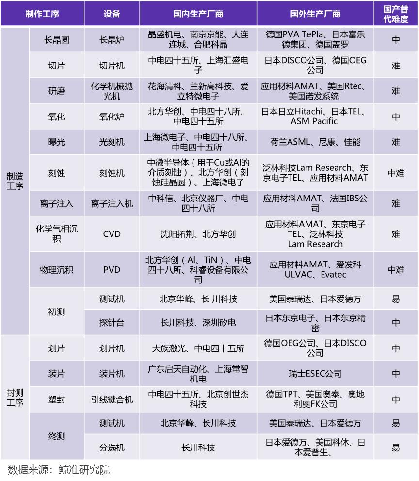 我们详细梳理了芯片的生产工序、相对应的设备以及国产化替代的难易程度。其中测试设备技术门槛较低,国内厂商占据了一定的市场份额,而制造设备不论是技术还是资金壁垒都较高,国内与发达国家相比还存在特别大的差距。
