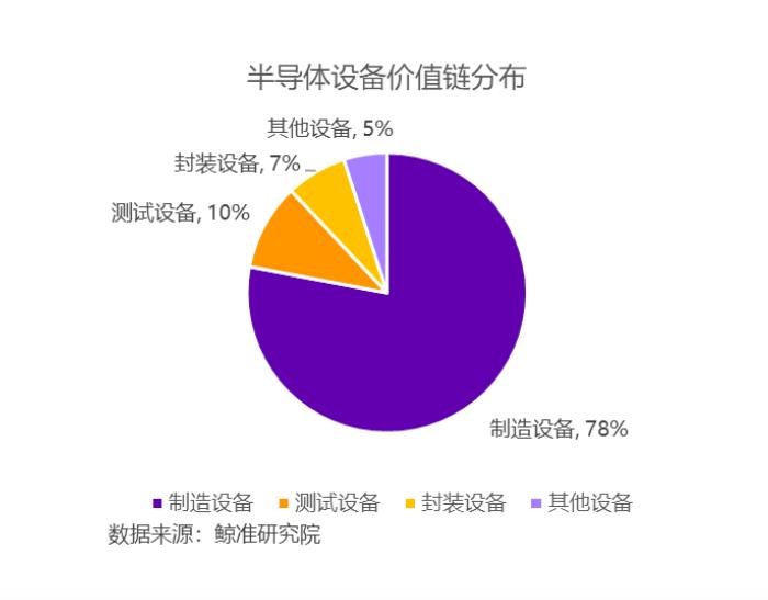 半导体设备主要包括晶圆制造设备、封装设备、测试设备、其他设备等。制造设备主要包括光刻机、刻蚀机和薄膜沉积设备等,封装设备主要包括切片机、装片机、引线缝合机等。测试设备主要包括测试机、分选机、探针台。按价值链分布,制造设备约占半导体设备的78%,测试设备约占10%,封装设备约占7%,其他设备约占5%。
