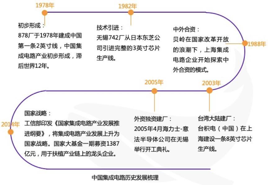 经过几十年的发展,中国大陆已经建立具有一定技术基础和较强国际竞争力的集成电路产业。从重大事件节点上来看,中国集成电路的发展大概经过初步形成→技术引进→中外合资→台湾大陆建厂→外资独资建厂→国家战略等多个阶段,完成了集成电路产业从无到有,从弱到强的历史性跨越。
