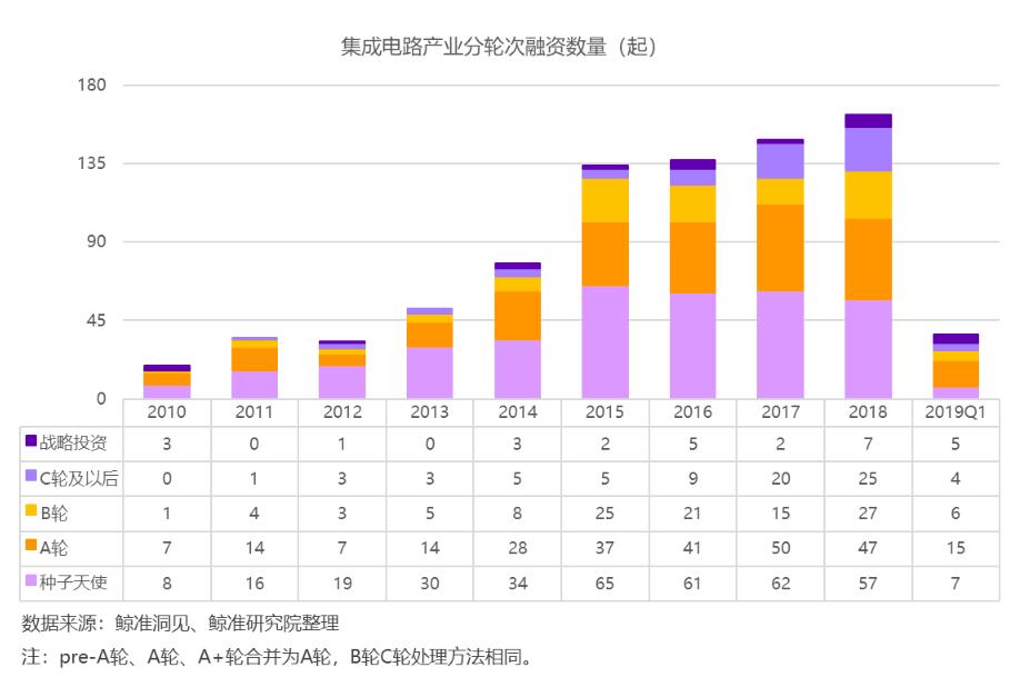 在一级市场中,2010年到2019年Q1,集成电路投资事件超过了835起,涉及的企业达到了450家,投融资金额约达1,077亿元。